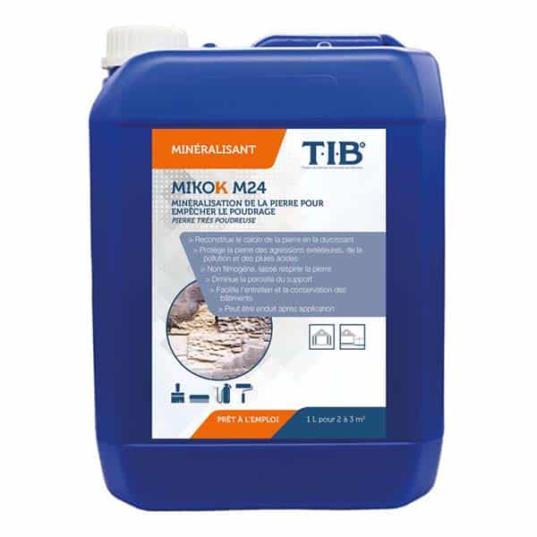 Le minéralisant MIKOK M24 permet de durcir un matériau fortement dégradé et de stopper le phénomène de « poudrage » des matériaux en décomposition, comme le calcin de la pierre par exemple. Sa composition permet à tous les matériaux naturels de conserver leurs caractéristiques et notamment leur perméabilité à l’air.